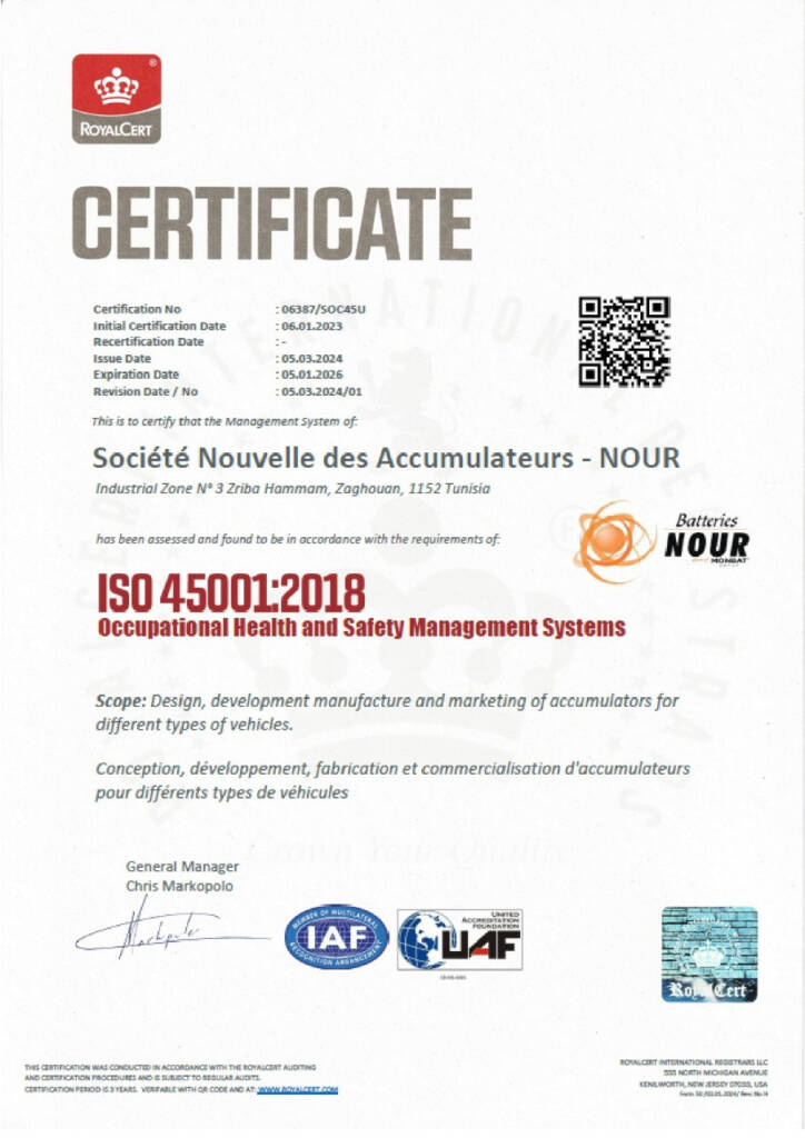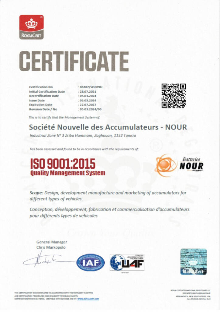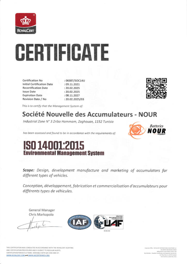 Chez Batteries NOUR, votre confiance est au cœur de notre démarche. Nous savons que la qualité et la sécurité des produits que nous vous fournissons sont essentielles, c’est pourquoi nous nous engageons à garantir un haut niveau de fiabilité à chaque produit, tout en minimisant notre impact sur l’environnement. Ces certifications sont le reflet de notre détermination à vous offrir des produits performants, durables et sûrs, tout en respectant les plus strictes normes environnementales et de sécurité. En choisissant Batteries NOUR, vous choisissez un partenaire fiable, qui s’investit pleinement pour vous offrir des produits à la fois de haute qualité et respectueux des exigences de durabilité et de sécurité.