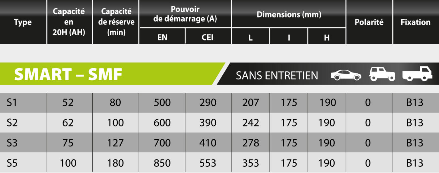 Elle est conçue pour les véhicules puissants avec les plus hauts exigences en termes de démarrage et de fiabilité, la gamme SMART offre la solution optimale à ces exigences. En outre, cette gamme offre une longue durée de vie et une grande endurance des batteries.